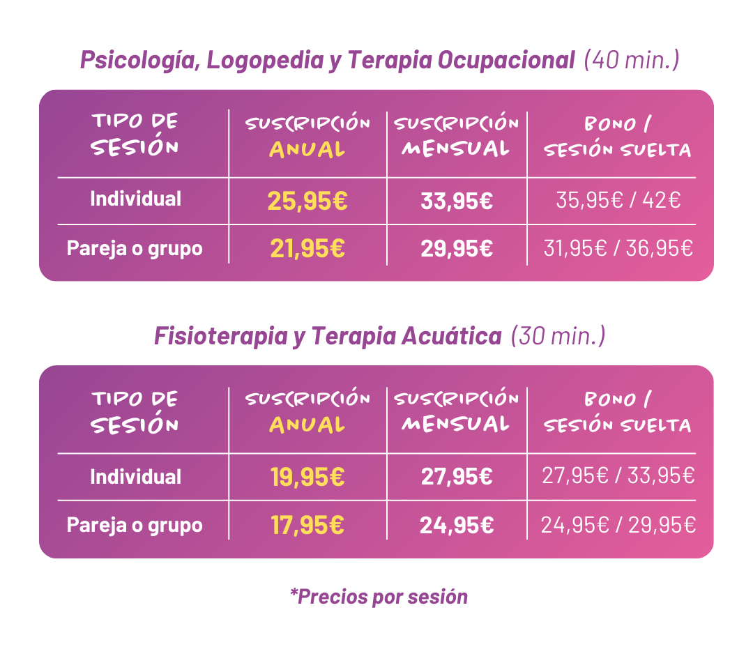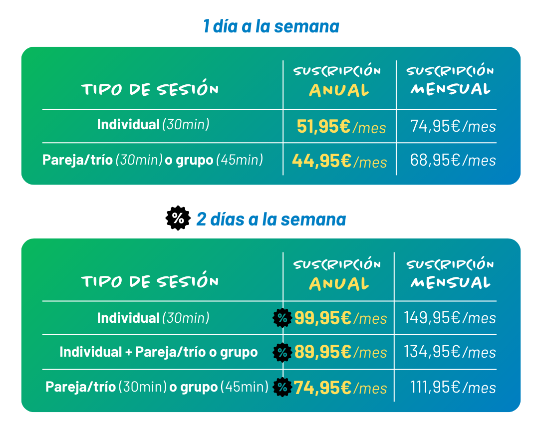 Disponemos de la Suscripción Anual (antes llamada Plan Pegasus), un sistema de precios bajos para que todo el mundo pueda acceder a los servicios de salud y deporte 🤗